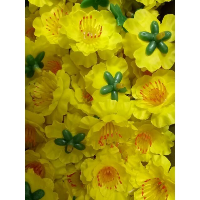 Giới thiệu 100gr bông hoa mai,hoa đào giả(70-80 bông) trang trí cây ngày tết gồm kẽm lá