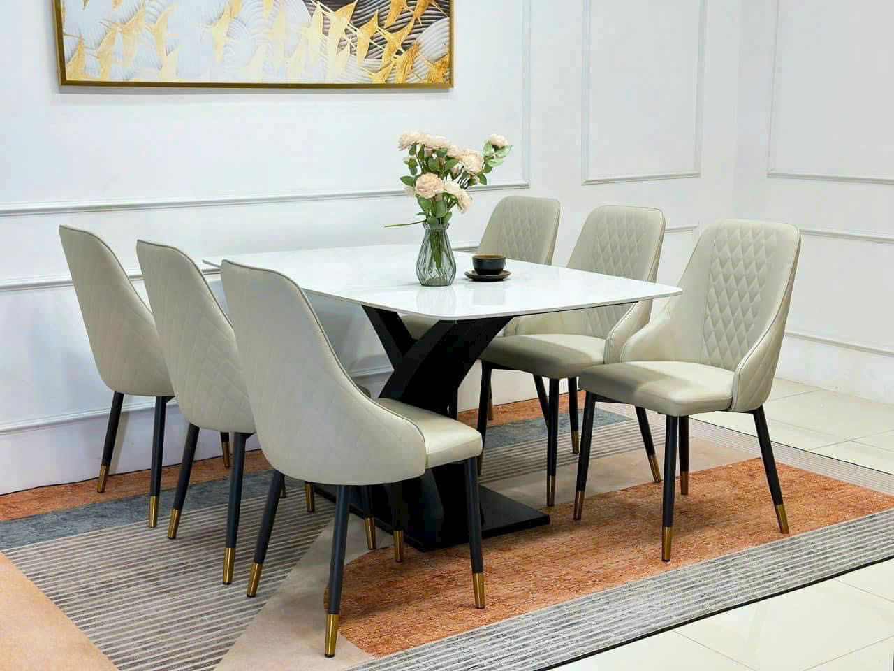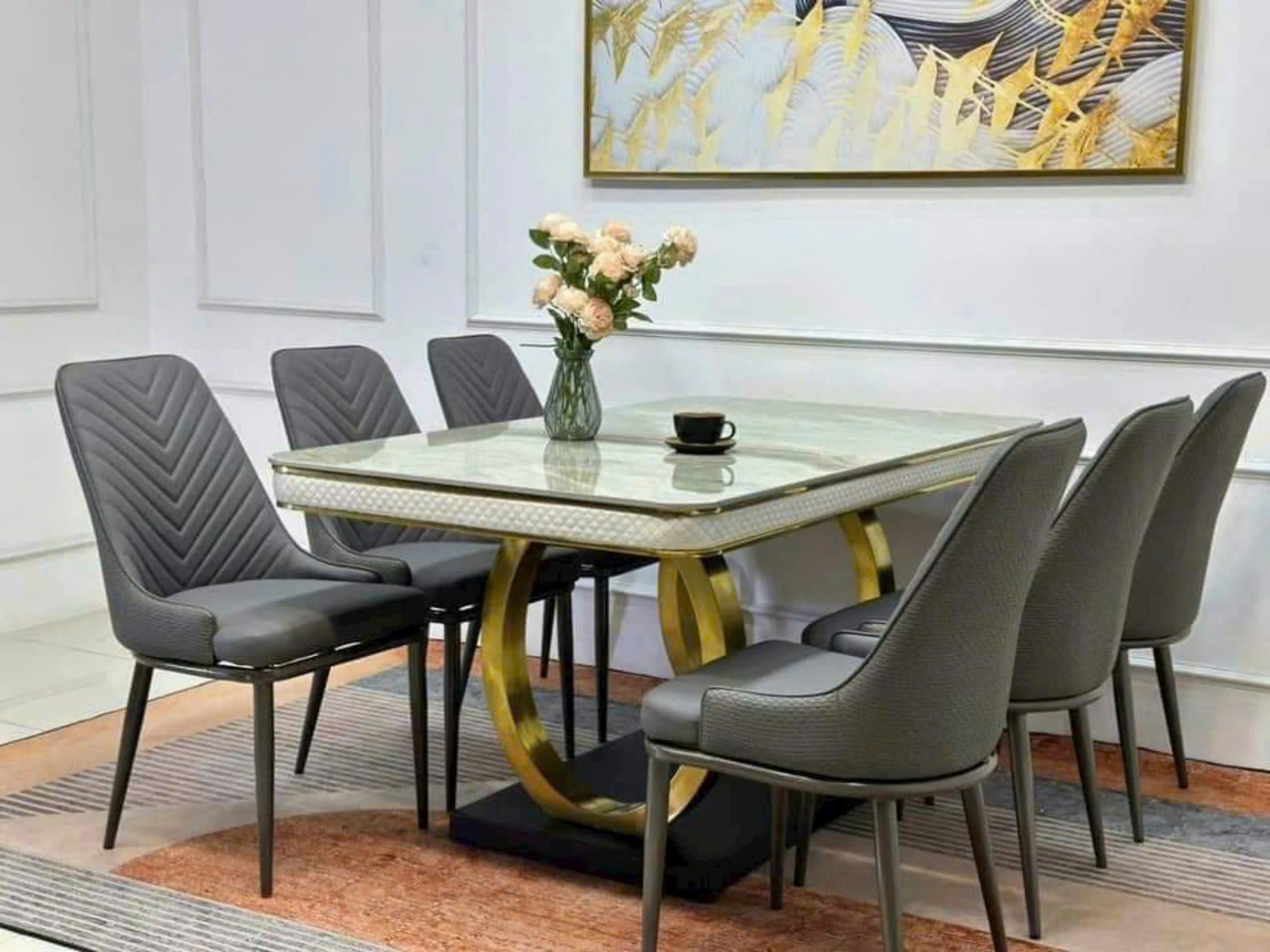 Chất liệu: Mặt đá Ceramic, chân sắt sơn tĩnh điện , đế thép sơn tĩnh điện, Inox tráng bạc, khung inox mạ vàng 201, có viền da bao quanh, đế thép sơn tĩnh điện ...