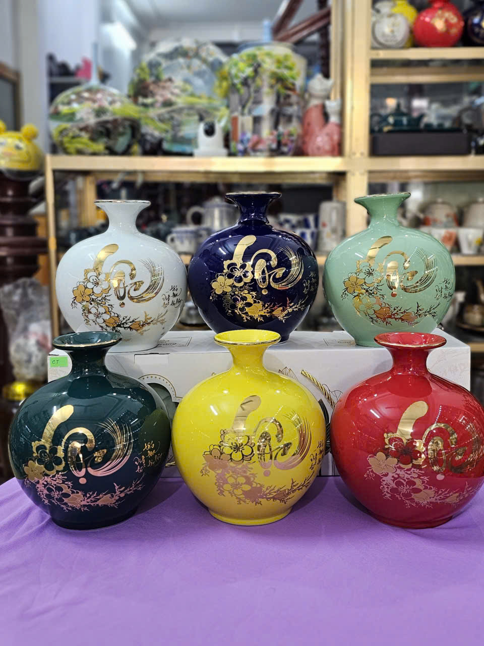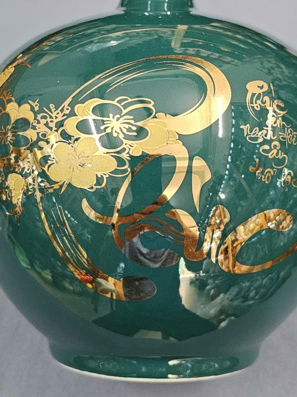 - NHẤT MỆNH - NHÌ VẬN - TAM PHONG THỦY. Trong Gốm Có Chữ Tranh, gốm là Tinh Hoa Đất Trời Ngũ Hành Tương Sinh với đầy đủ 5 yếu tố Kim, Mộc, Thủy, Hỏa, Thổ ảnh hưởng đến sự phát triển và thành đạt của mỗi con người. - Với Bình hút tài lộc chữ thư pháp "PHÚC" và "LỘC" vẽ vàng 18k là biểu trưng cho tài lộc, may mắn, và hạnh phúc viên mãn, tròn đầy. Hình ảnh có nguồn thủy khí dồi dào, mang đến cho gia chủ tài lộc vô biên.