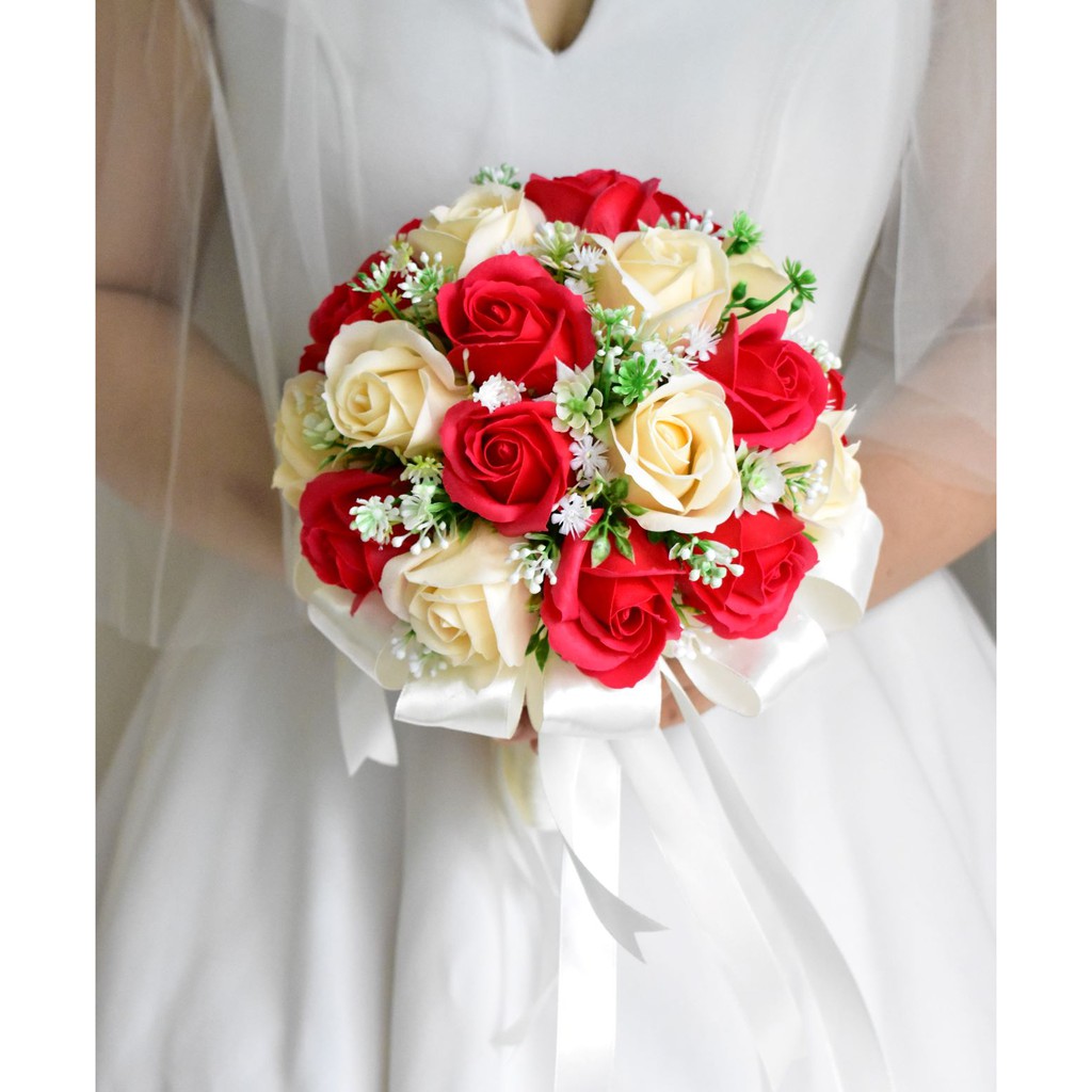 Nhà cửa & Đời sống > Trang trí nhà cửa > Hoa trang trí || BÓ HOA CƯỚI CẦM TAY CÔ DÂU BẰNG HOA HỒNG SÁP THƠM MÀU ĐỎ, TẶNG KÈM HOA CÀI ÁO CHÚ RỂ