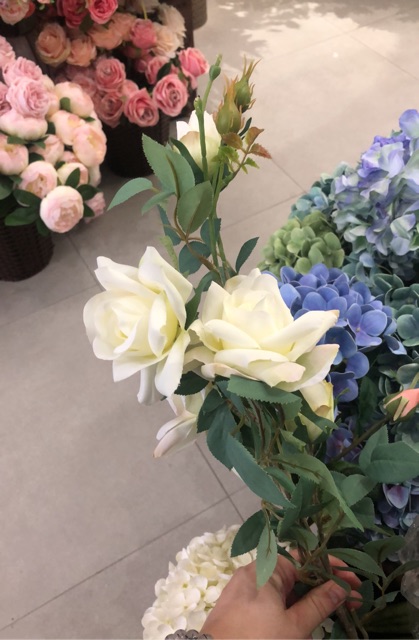 Cành hồng kim cương 3 bông 2 nụ & lộc - giả cao cấp dài 80cm (hoa rất nhiều lộc lá nên giống thật các bạn nhé ^^)
