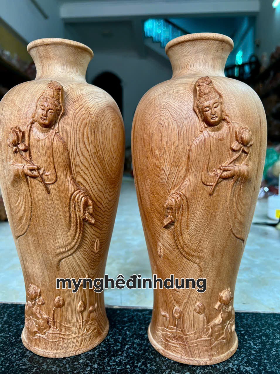 _ Cặp lục bình thân bình được khắc mẹ quan âm bồ tát tỉ mỉ tinh xảo kỳ công. ĐI HẦU hết tất cả mọi chi tiết góc ngách nội dung hoa văn của tượng đều được gọt tỉa chỉnh sửa sắc nét hoàn toàn bằng tay thủ công truyền thống.