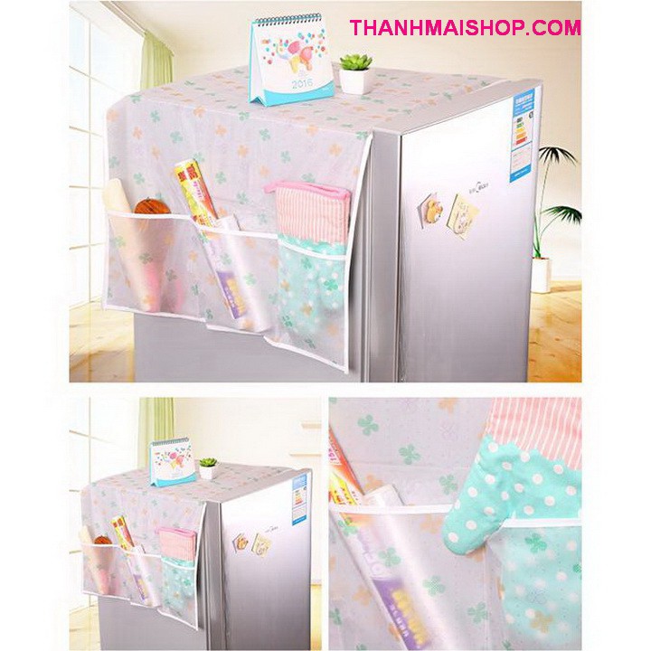 🔰 Tấm phủ tủ lạnh PEVA trong suốt 2in1 tiện dụng được làm từ chất liệu nhựa PEVA trong suốt cao cấp, chống thấm nước, với các họa tiết đẹp như chấm bi, cỏ 4 lá, hoa hồng, cúc xanh, động vật... đầy màu sắc, thiết kế khăn phủ vừa vặn lên phần nóc tủ lạnh, che được cả 2 bên hông tủ, hai bên có thêm 3 ngăn nhỏ đựng đồ, giúp bạn tiết kiệm không gian và tiện ích hơn cho việc nấu nướng, tô điểm cho tủ lạnh và phòng bếp thêm sinh động.