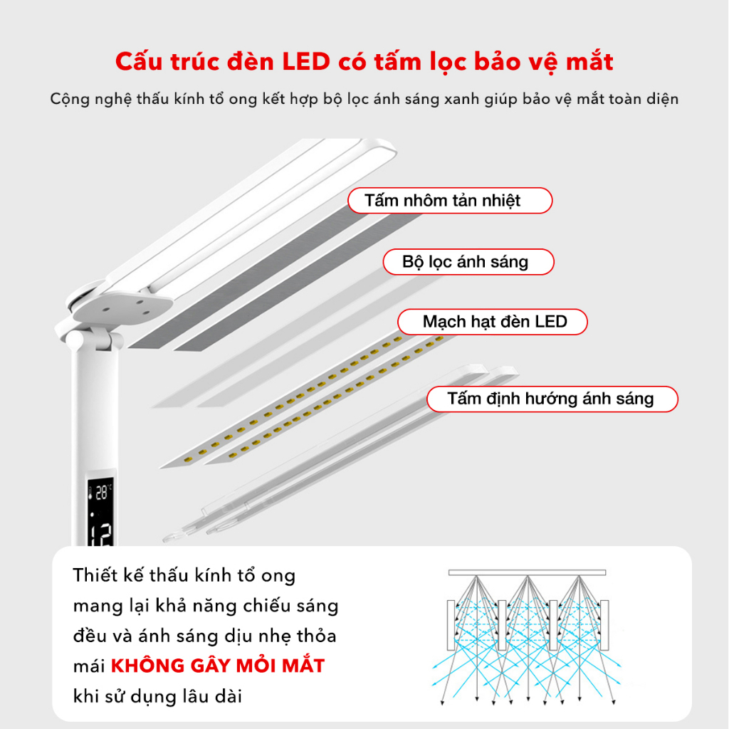 Đèn Học Chống Cận Đọc Sách Tích Điện 3 Chế Độ Sáng, Màn Hình Led Thông Minh - Tên sản phẩm: Đèn học chống cận thông minh 3 chế độ - Chất liệu: Nhựa ABS+kim loại - Phong cách: Trắng sang trọng, tinh tế - Kích thước sản phẩm: 27*35*16cm - Chỉ số tạo màu (Ra): ≥70 - Nhiệt độ ánh sáng: 2800 - 6500k - Tuổi thọ: 80000 (giờ) - Điều khiển: Cảm ứng chạm đa điểm - Ứng dụng: Đèn học, đèn bàn làm việc, đèn đọc sách 1) Dùng trực tiếp cắm dây sạc vào cổng USB 2) Hiển thị: Đèn này có ngày tháng năm, nhiệt kế, đồng hồ LED hiển thị. 3) 3 chế độ sáng: Đèn bàn led bảo vệ mắt này cung cấp 3 lựa chọn chế độ làm mờ (Vàng/Trắng ấm/Trắng) cho công việc (văn phòng), đọc sách (học tập), thư giãn (phòng ngủ) và hơn thế nữa, bạn có thể chọn màu sắc phù hợp nhất của đèn phù hợp với bạn nhất. 4) Mắt - Đèn được bảo vệ: đèn đọc sách led không có đèn nhấp nháy. Đèn bàn học sinh nhẹ nhàng và tươi sáng cho văn phòng tại nhà có thể bảo vệ đôi mắt của bạn, đây là một lựa chọn quà tặng Giáng sinh tốt cho trẻ em, bạn bè và những người khác. 5) 3 chế độ sáng : Đèn bàn led bảo vệ mắt này cung cấp 3 chế độ sáng, nhiệt độ màu dao động từ 2800K đến 6500K, bạn có thể thoải mái điều chỉnh độ sáng của đèn bàn led mà không gây khó chịu cho mắt và chọn độ sáng yêu thích. 6) Góc linh hoạt: Đầu đèn có thể điều chỉnh có thể xoay lên xuống 180o hoặc thân đèn có thể xoay 90o nên điều chỉnh độ cao rất tiện lợi và bạn có thể chiếu đèn vào nơi bạn cần, và chân đèn sẽ luôn chắc chắn khi bạn điều chỉnh góc. Thiết kế có thể gập lại của nó cho phép bạn mang theo dễ dàng và tiết kiệm nhiều không gian hơn