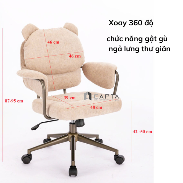 Để tối ưu trải nghiệm người dùng, ghế tích hợp đầy đủ các tính năng hiện đại: xoay 360 độ linh hoạt kèm chức năng gật gù cho phép ngả lưng thư giãn. Ghế còn có thể tăng giảm độ cao dễ dàng, phù hợp nhiều chiều cao bàn làm việc. Ghế xoay bọc nệm vải nhỏ gọn CE23002-F là lựa chọn lý tưởng cho mọi nhu cầu từ làm việc văn phòng, học tập đến thư giãn.