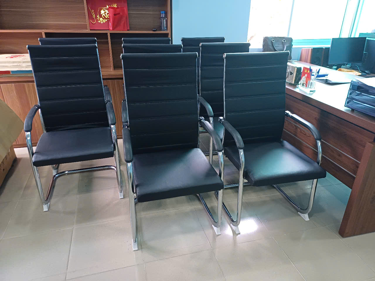 Ghế tiếp khách nệm PVC êm ái, thoải mái và dễ dàng vệ sinh thân ghế. Tay ghế khung thép cùng lớp ốp nhựa đen cao cấp giúp nâng đỡ khuỷu tay. Chân thép mạ chrome bóng chắc chắn, bền bĩ theo thời gian.