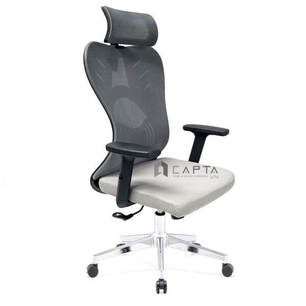 Lưng tựa hình chữ S cong theo cột sống. Điểm đặc biệt là lưng ghế được trang bị thêm miếng đệm nhựa ngay vị trí thắt lưng giúp giảm mỏi hiệu quả. Tay ghế nhựa chữ T hiện đại nâng hạ chiều cao theo tư thế ngồi làm việc. Ghế làm việc có tựa đầu tùy chỉnh độ cao xua tan các cơn nhức mỏi cổ vai gáy.
