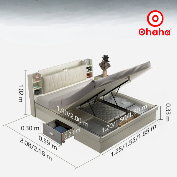 Sản phẩm được thiết kế phần đầu đơn giản được bọc thêm đệm hiện đại. Hệ các tủ đựng quần áo ẩn phía dưới gầm giường tận dụng tối đa không gian để chứa đồ và có gắn thêm trợ lực chống đẩy giúp người dùng có thể nâng lên hạ xuống một cách dễ dàng. Ngoài ra, khách hàng có thể lắp đặt thêm hệ đèn Led đầu giường bật sáng bất cứ lúc nào.