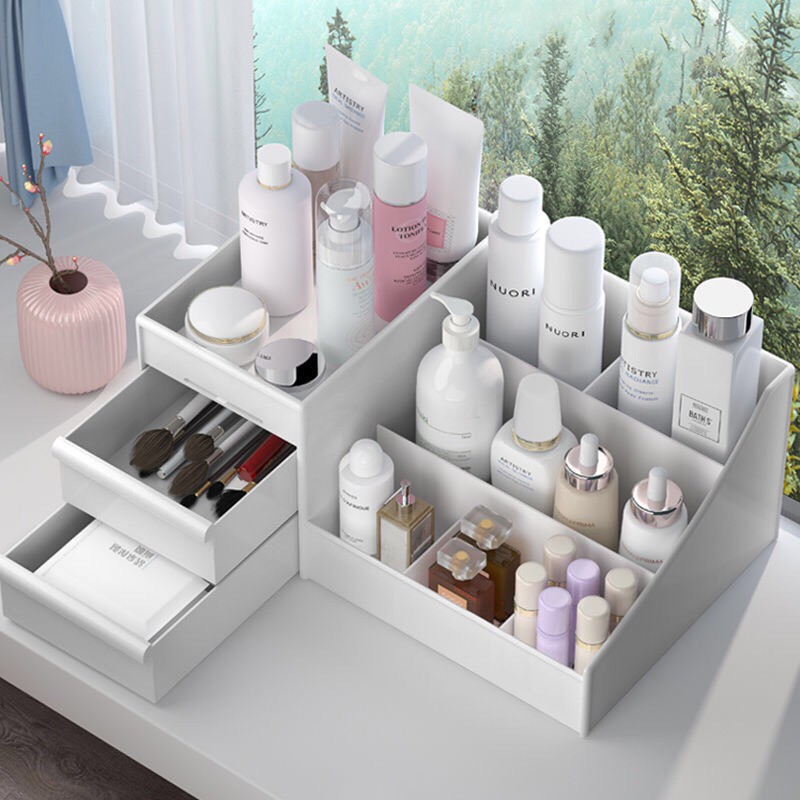 - Khay đựng mỹ phẩm được thiết kế nhỏ gọn, cấu tạo các ngăn đựng khoa học với 3 tầng và 5 ngăn nhỏ. Ngoài ra, tủ đựng đồ trang điểm này còn có thêm 2 ngăn kéo, để đựng được nhiều đồ tiện dụng.