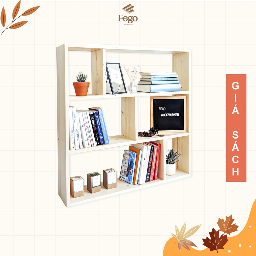 Kệ sách gỗ thông nhiều ngăn 3 tầng FEGO nội thất phòng khách, decor phòng làm việc