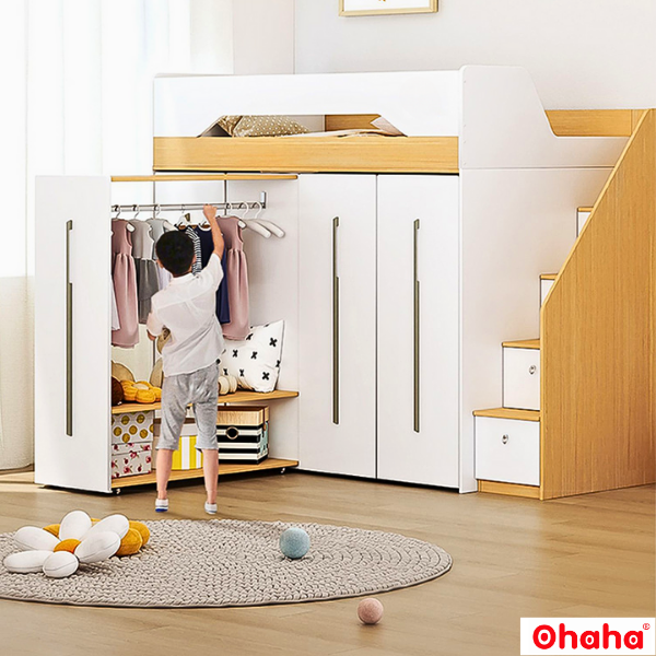 Mẫu Giường tầng thông minh Ohaha kết hợp tủ áo - GTTM014 sở hữu thiết kế thông minh phù hợp với các căn phòng có không gian hạn chế, đồng thời cũng mang đến nhiều công năng hữu dụng. Chỉ trong một sản phẩm, bạn có thể tận dụng được nhiều món đồ nội thất mà lại không chiếm quá nhiều diện tích không gian.