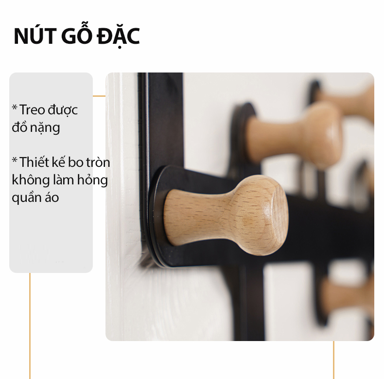 Đầu móc treo sử dụng các nút gỗ đặc gắn vào thanh treo, các nút gỗ này được bo tròn, làm nhẵn và làm to phần đầu nút giúp giữ quần áo không bị rơi, đồng thời bảo vệ quần áo không bị hư hại khi treo