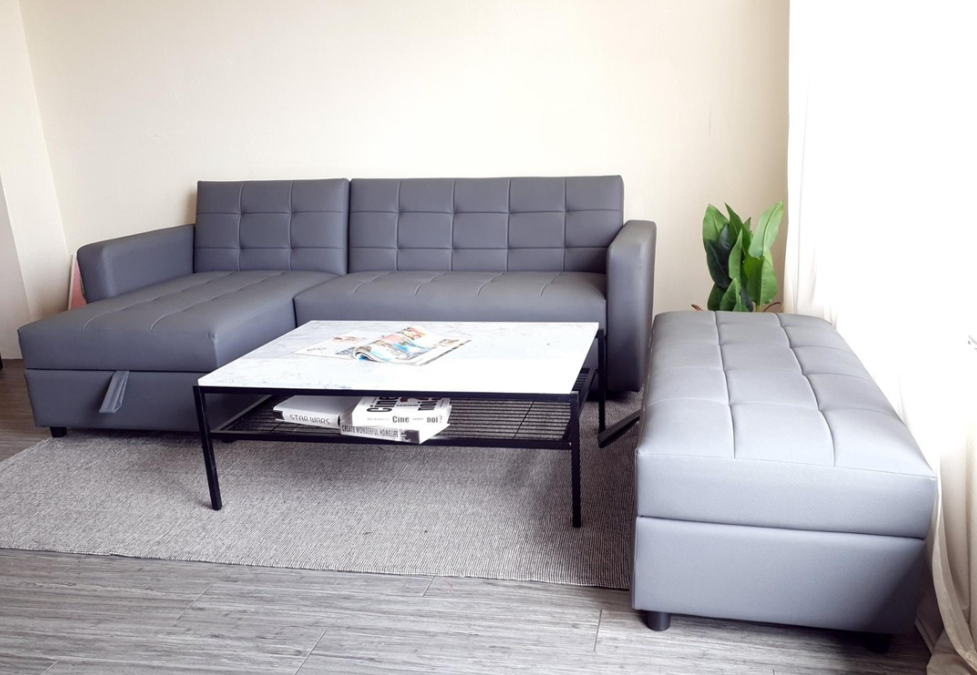 Sofa góc Căn hộ Chung cư Tundo 2m2 x 1m4 và đôn dài 60 x 80 cm. Hộc chứa đồ thông minh dưới ghế.