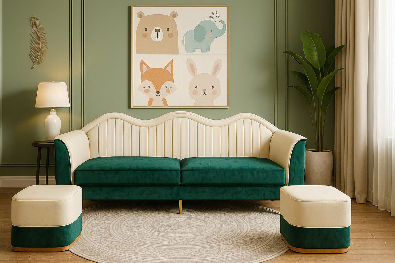 Sofa vải nhung Tundo Emerald Sofa kết hợp trắng xanh 2m và 2 đôn