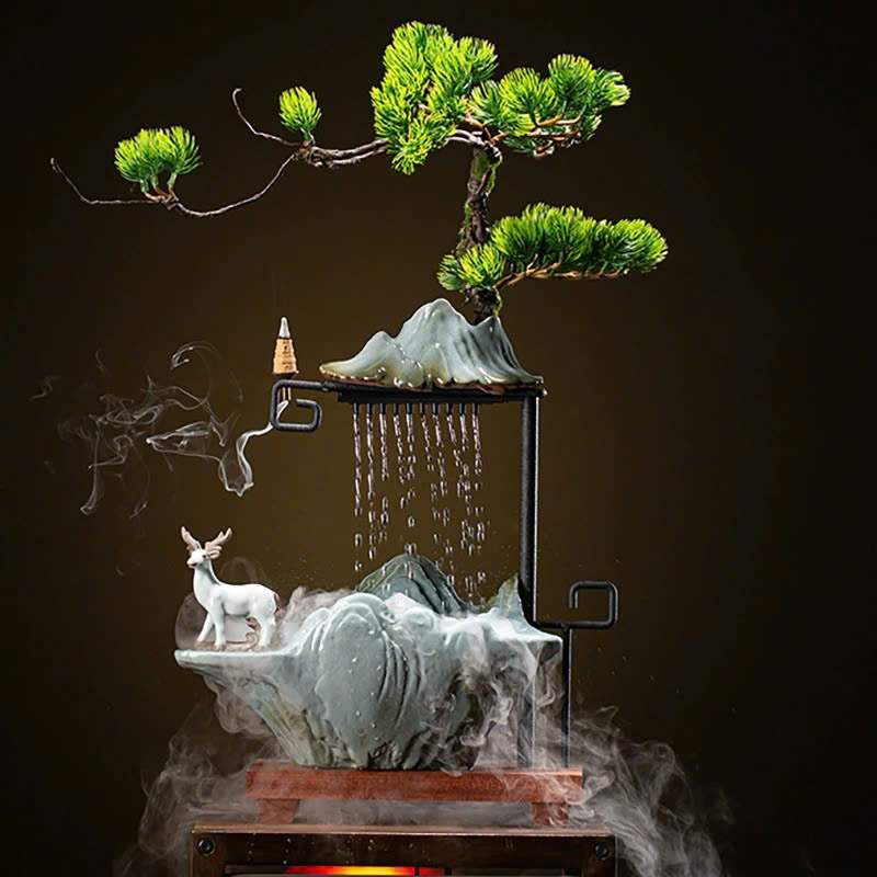 Thác nước tiểu cảnh phong thủy Tùng Hươu xông trầm kèm phun sương là món đồ decor phong thủy cao cấp, kết hợp hài hòa giữa dòng nước chảy, làn khói trầm bay và hơi sương mờ ảo, tạo nên không gian thanh tịnh, thư thái và may mắn cho gia chủ.