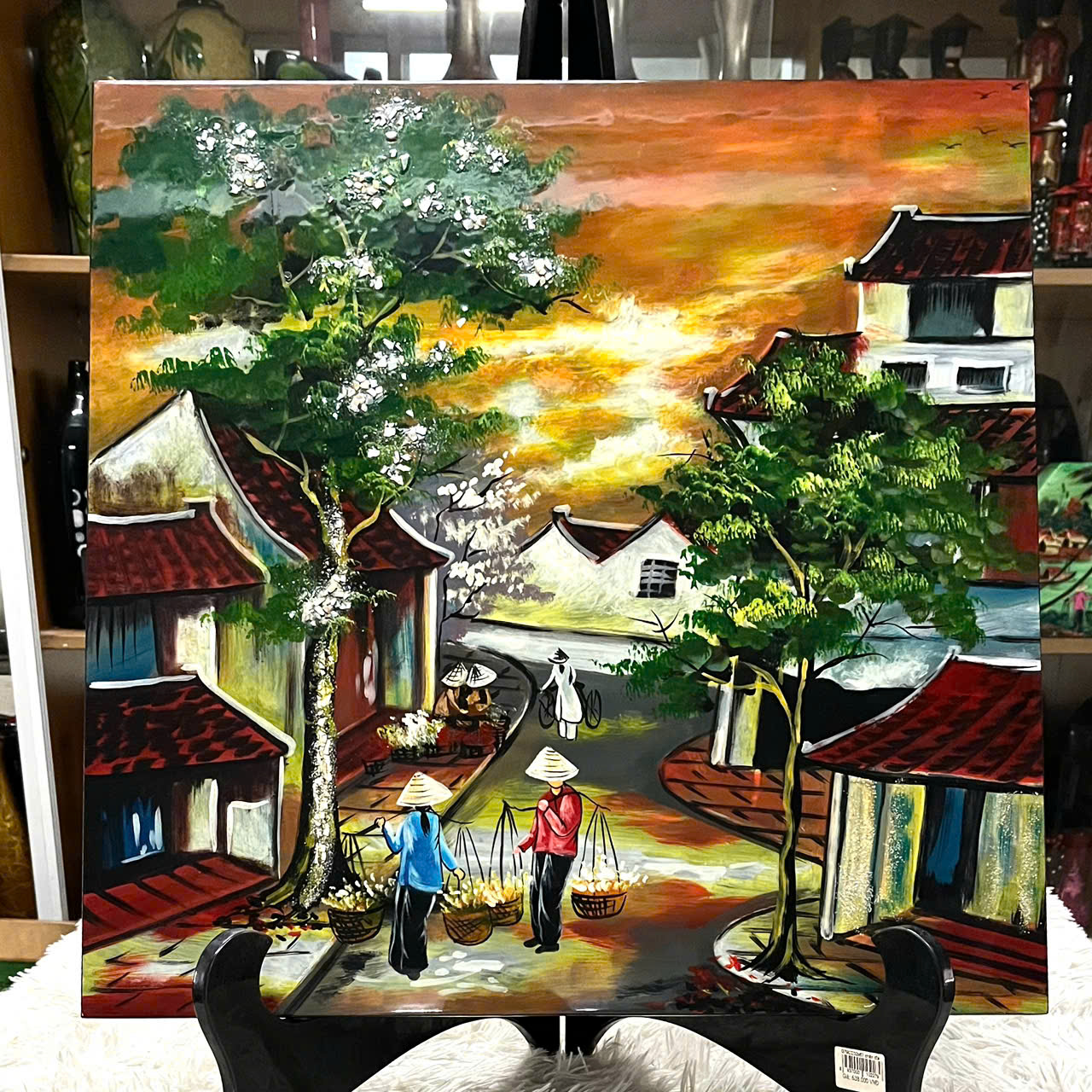 Tranh sơn mài -Bác Hồ quàng khăn đỏ cho học sinh